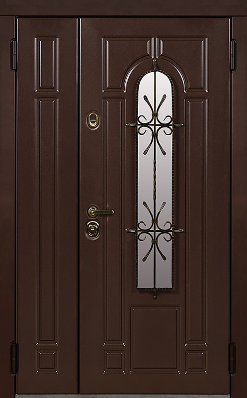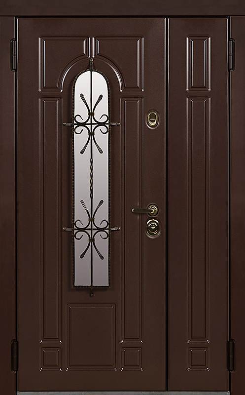 Эта металлическая двухстворчатая дверь с арочным стеклопакетом №15 представляет собой идеальный баланс между эстетикой и прочностью. Арочное стекло добавляет в её дизайн утончённость, а ковка в декоре придаёт изысканный, но в то же время крепкий и надёжный вид. Плита МДФ, используемая как для внешней, так и для внутренней отделки, не только сохраняет прекрасный внешний вид, но и устойчива к механическим повреждениям. Металлическая двухстворчатая дверь с арочным стеклопакетом №15 от производителя: быстрое изготовление и монтаж в Зеленограде, индивидуальные размеры, широкий выбор материалов и фурнитуры, официальная гарантия до 10 лет.