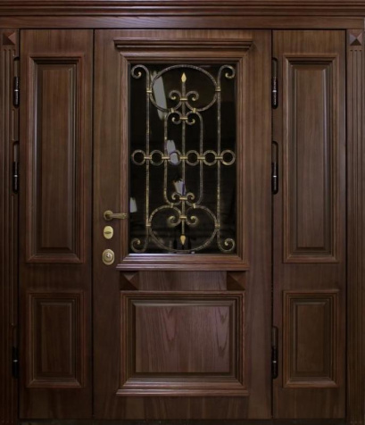Входная металлическая дверь с порошковым покрытием, стеклом и ковкой в частный дом №27 — это не только надежность, но и стильное решение для вашего коттеджа или частного дома. Массив дерева, использованный в отделке снаружи и внутри, придаёт двери тепло и элегантность, в то время как прочная металлическая конструкция с профильной трубой и листом металла толщиной 2 мм обеспечивает долговечность и защиту. Стекло и кованые элементы добавляют изысканности, а порошковое покрытие защищает от внешних воздействий, сохраняя первоначальный вид. Терморазрыв в коробке и полотне помогает минимизировать теплопотери, а эффективная система уплотнения с двумя контурами гарантирует уют и тишину в вашем доме. Входная металлическая дверь с порошковым покрытием стеклом и ковкой в частный дом №27 от производителя: быстрое изготовление и монтаж в Зеленограде, индивидуальные размеры, широкий выбор материалов и фурнитуры, официальная гарантия до 10 лет.