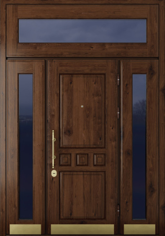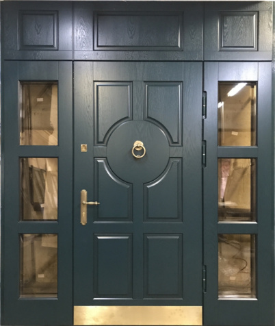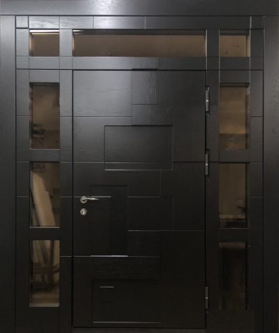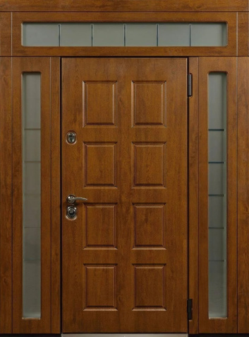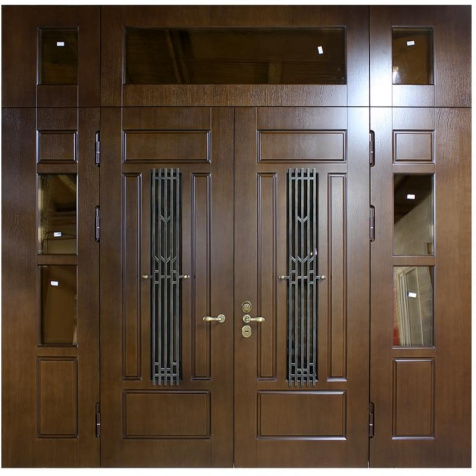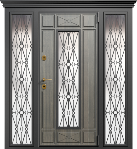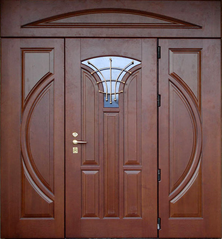 Если проём очень широкий, но не хочется устанавливать двустворчатую модель, используют комбинированные решения. Например, широкая входная дверь со стеклом или глухими боковыми вставками. По бокам основной створки могут быть узкие неподвижные панели: они уменьшают фактическую ширину открывающейся части и украшают вход. Такие вставки нередко содержат стеклопакет с декоративной решёткой или ковкой – подобный дизайн популярен для загородных коттеджей. Остекление выполняется из ударопрочного материала, чтобы дверь оставалась надёжной и безопасной.